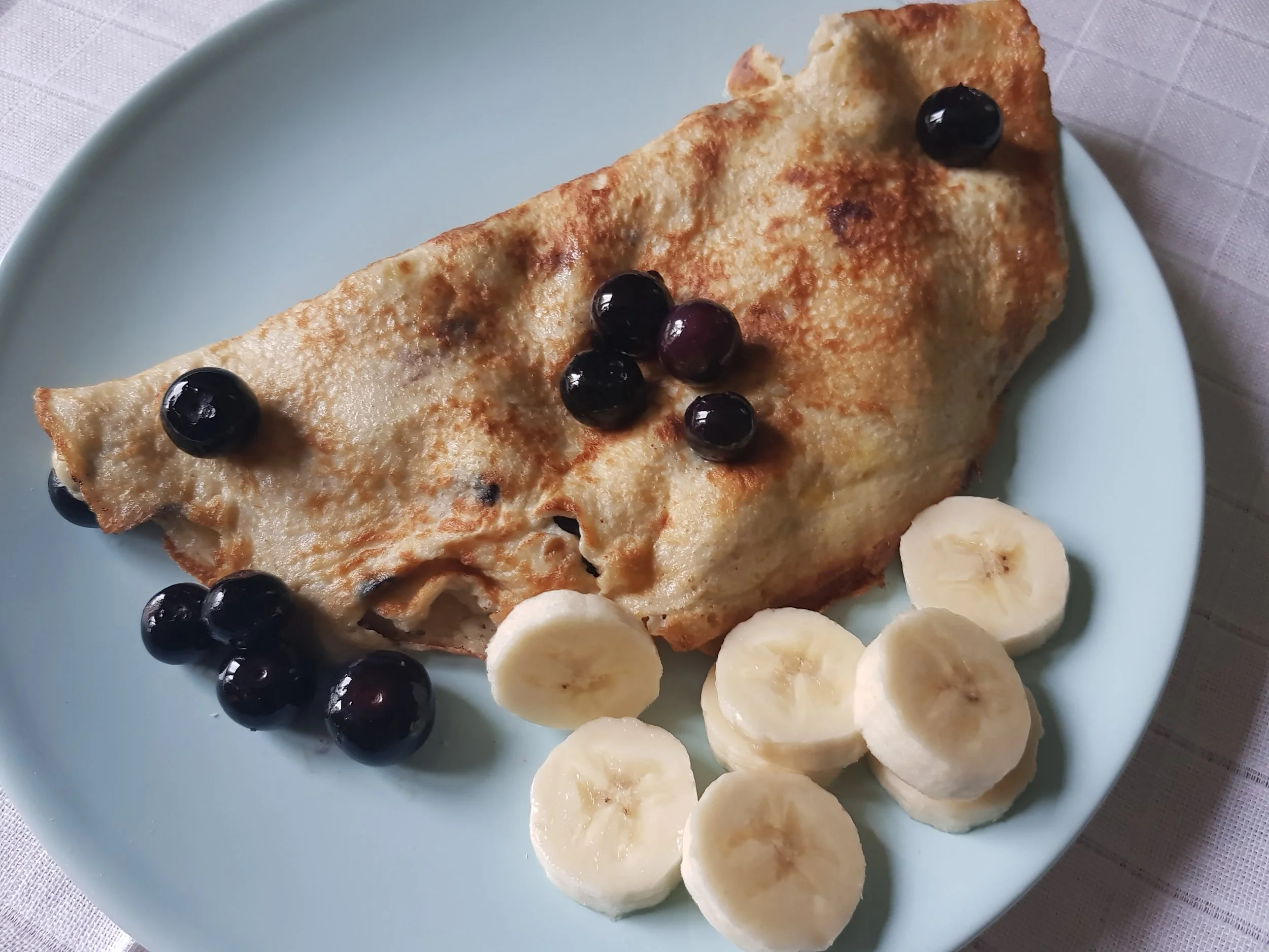 Pour the mixture into the frying pan as if making an omelette. Sprinkle the blueberries on top and allow to cook for around 5 minutes.